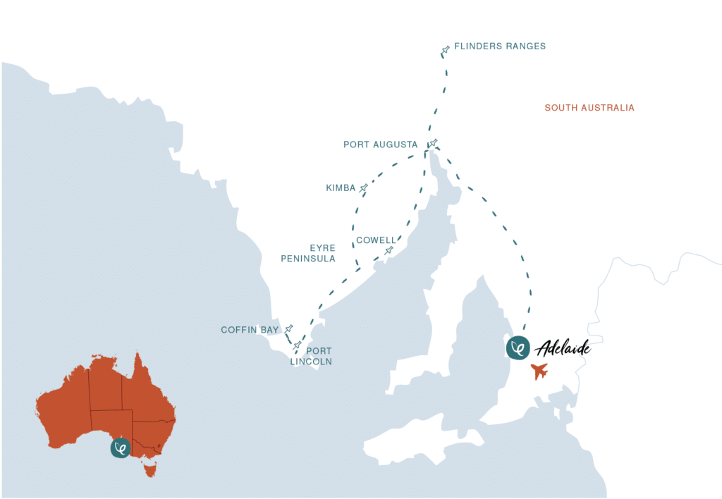 In the coastal town of Cowell, pause to admire striking silo art that tells local stories in towering scale, then continue to Port Lincoln. Here, you’ll be welcomed onto Barngarla Country with a heartfelt Welcome to Country ceremony led by proud Barngarla woman Emmalene Richards. A powerful moment of cultural connection to set the tone for your journey.